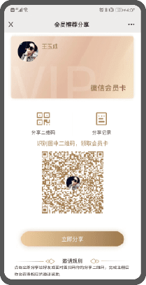 会员裂变会员分享微信卡包,邀请好友注册,不仅建立推荐关系,且能自动获得积分、现金或卡券奖励。